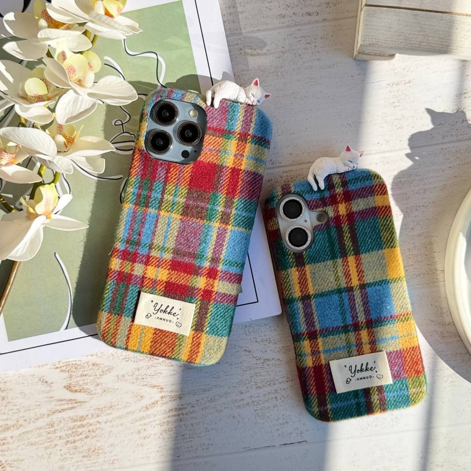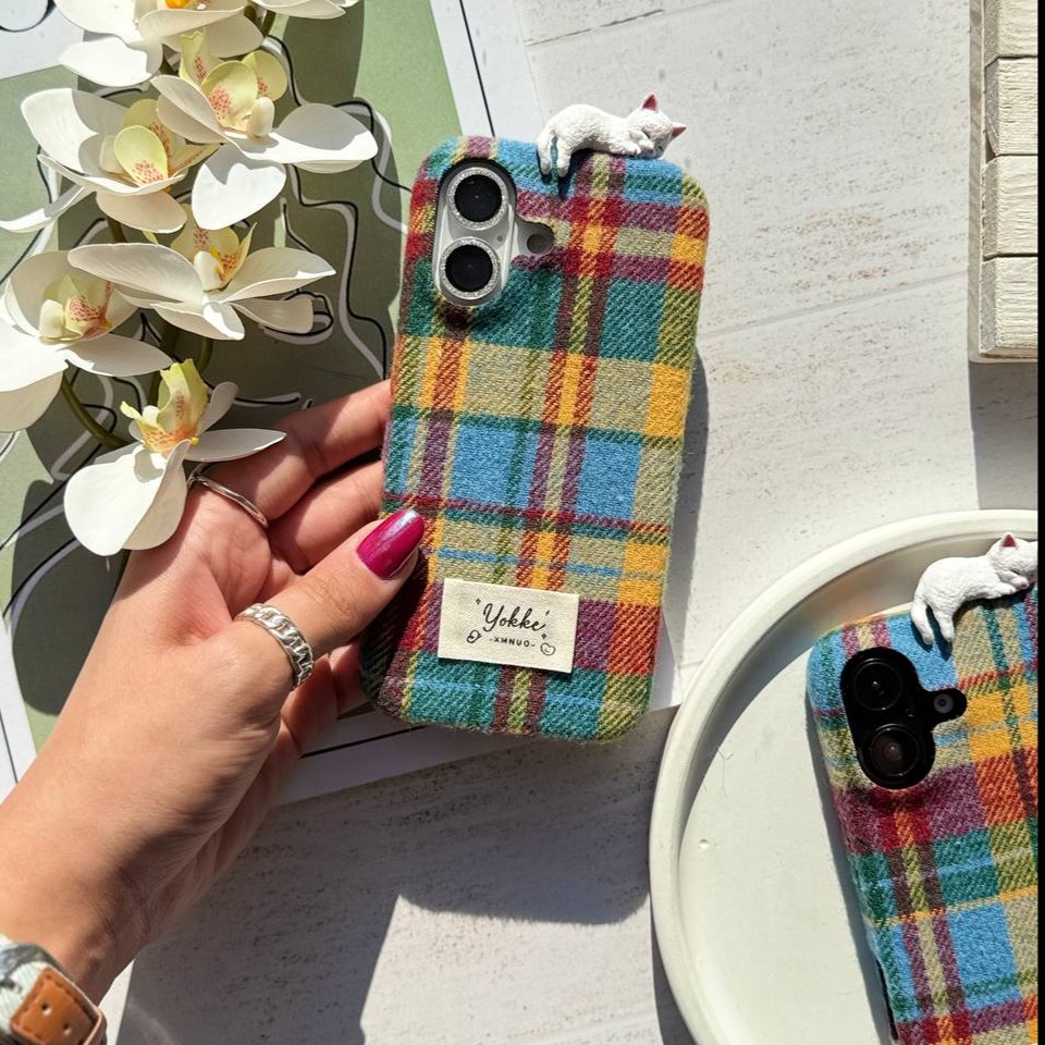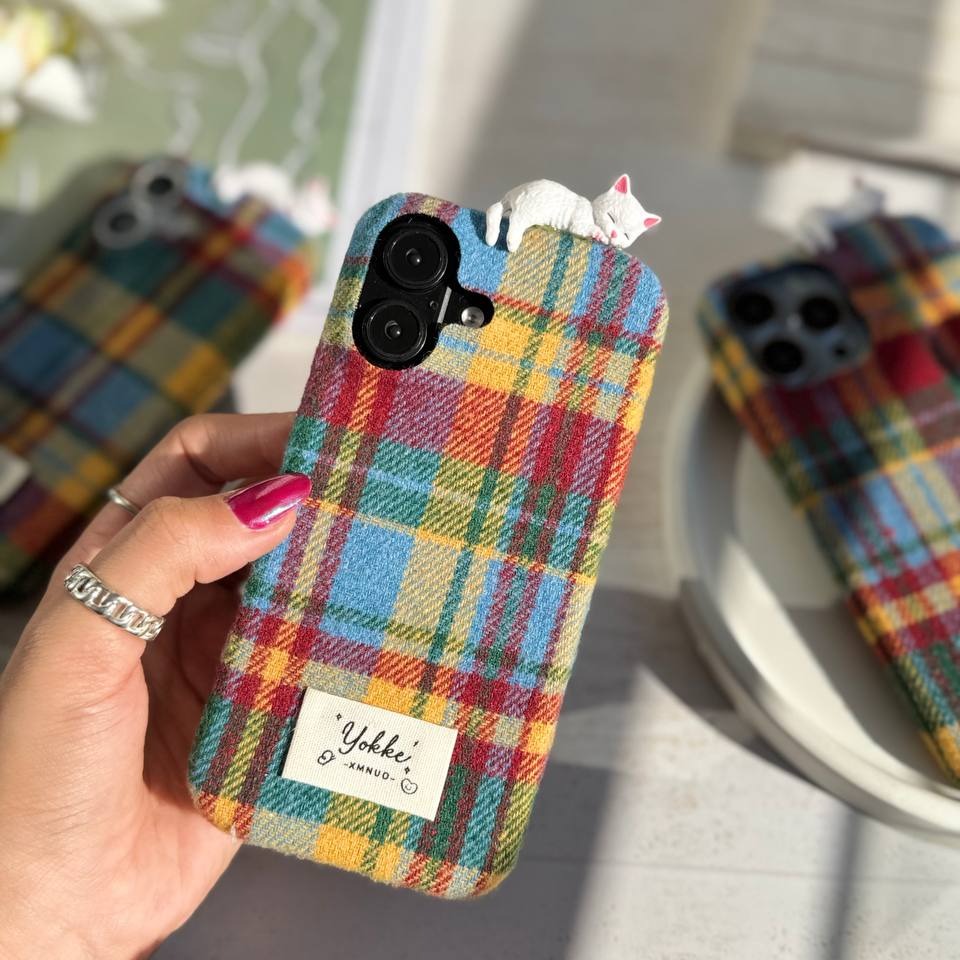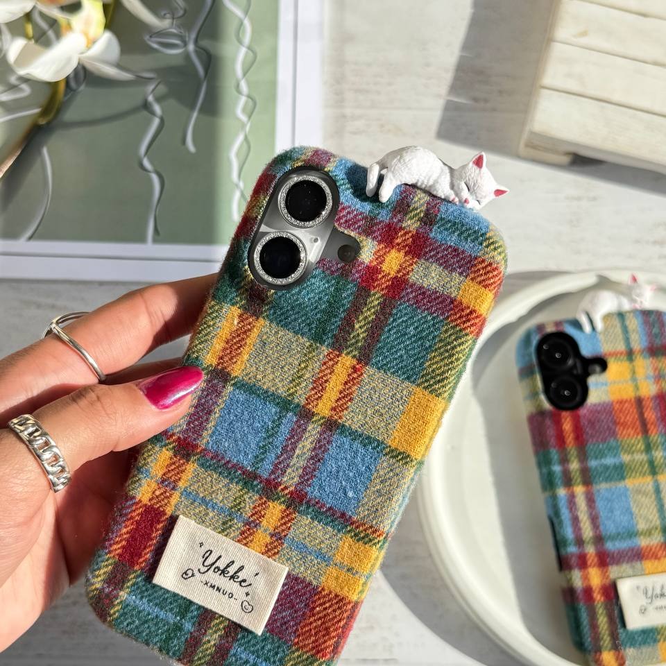 این قاب با ترکیب پارچهای طرح چهارخونه کلاسیک و جزئیات بامزهی یه گربه سفید که بالای قاب لم داده، حس گرما، لطافت و خاص بودن رو به گوشیت میده.