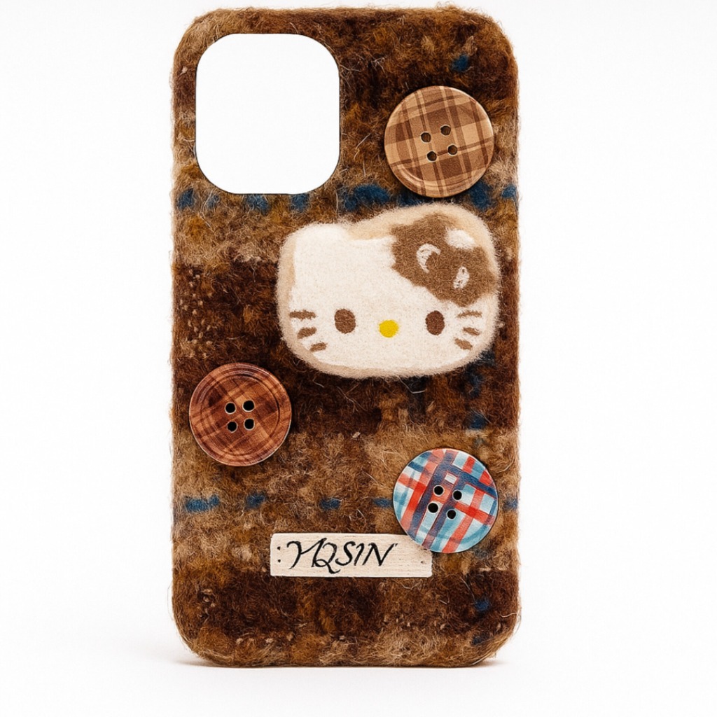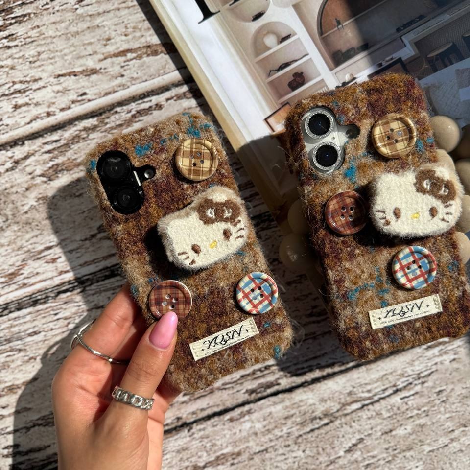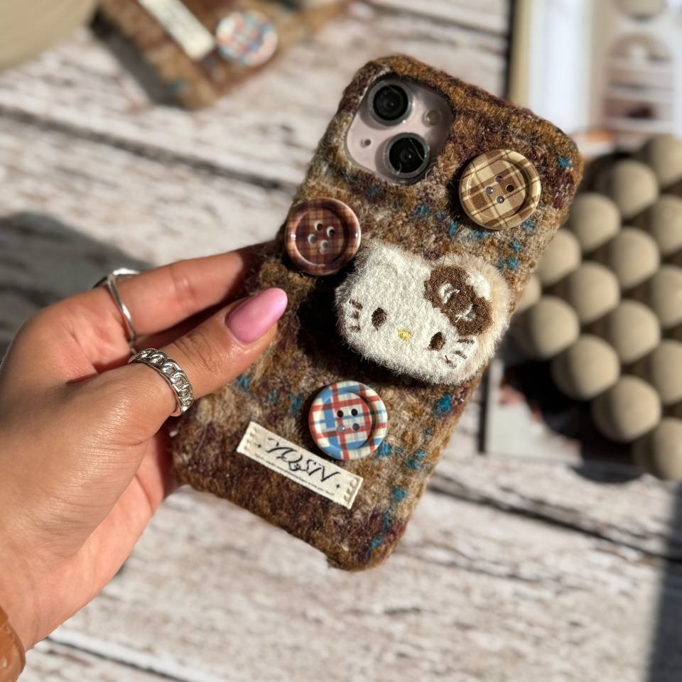 🧸 قاب آیفون پشمی عروسکی طرح Kitty دکمهدار | خاص، نرم و دلربا 🍂